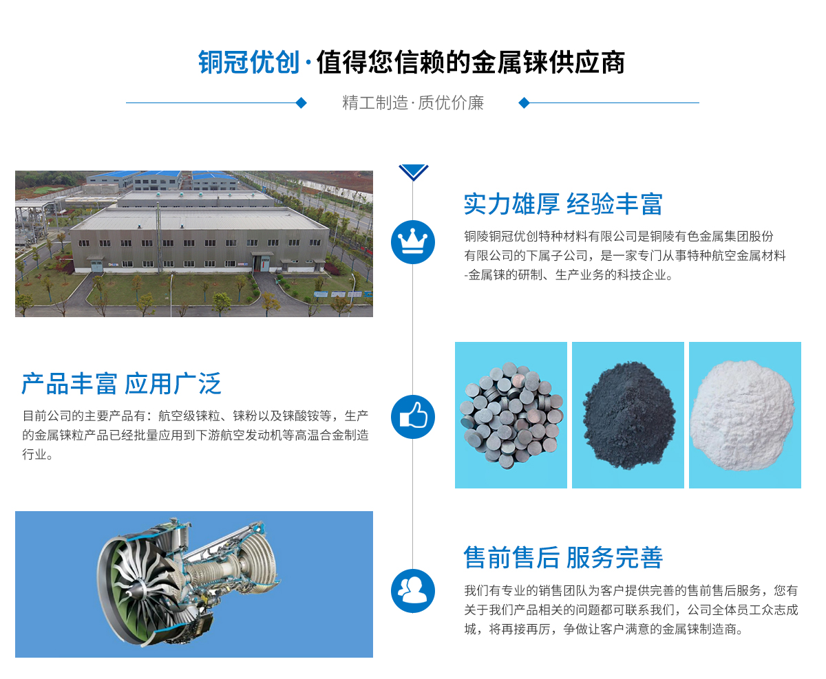 - 銅陵銅冠優(yōu)創(chuàng)特種材料有限公司是銅陵有色金屬集團(tuán)股份有限公司的下屬子公司,是一家專門從事特種航空金屬材料-金屬錸的研制、生產(chǎn)業(yè)務(wù)的科技企業(yè)。公司創(chuàng)始于2018年,廠址位于銅陵市經(jīng)濟(jì)技術(shù)開發(fā)區(qū),一期項(xiàng)目于2019年6月完工并順利投產(chǎn)。截至目前公司的主要產(chǎn)品有:航空級錸粒、高純錸粉以及高純錸酸銨等。 銅冠優(yōu)創(chuàng)公司錸原料源于銅陵有色集團(tuán)內(nèi)供,銅陵有色集團(tuán)是安徽省國資委控股的國有獨(dú)資公司,世界500強(qiáng)企業(yè),世界較大的銅冶煉企業(yè),每年從世界各地進(jìn)口近 400 萬噸含錸銅精砂,相當(dāng)于每年從全球收集錸資源 5-8 噸。 銅冠優(yōu)創(chuàng)公...